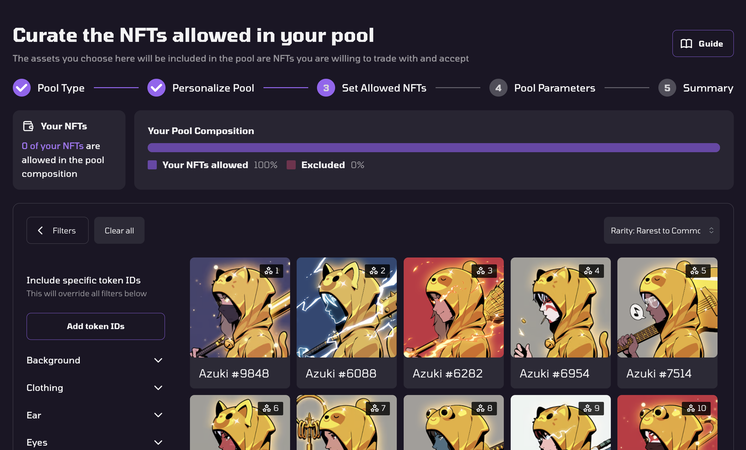 5\. You may customize your NFT Pool on this page. You may filter the selected NFTs you would like to trade with based on tokenIDs, traits, and rarity.